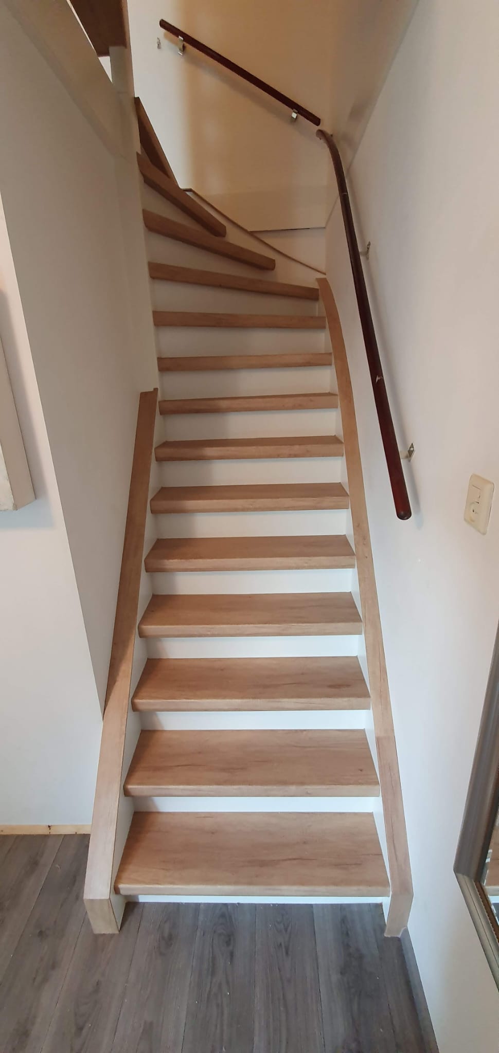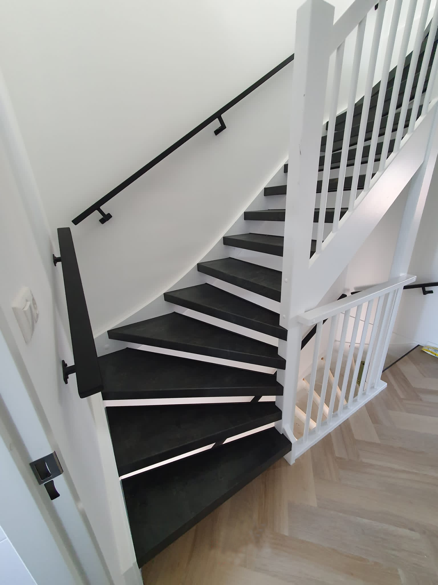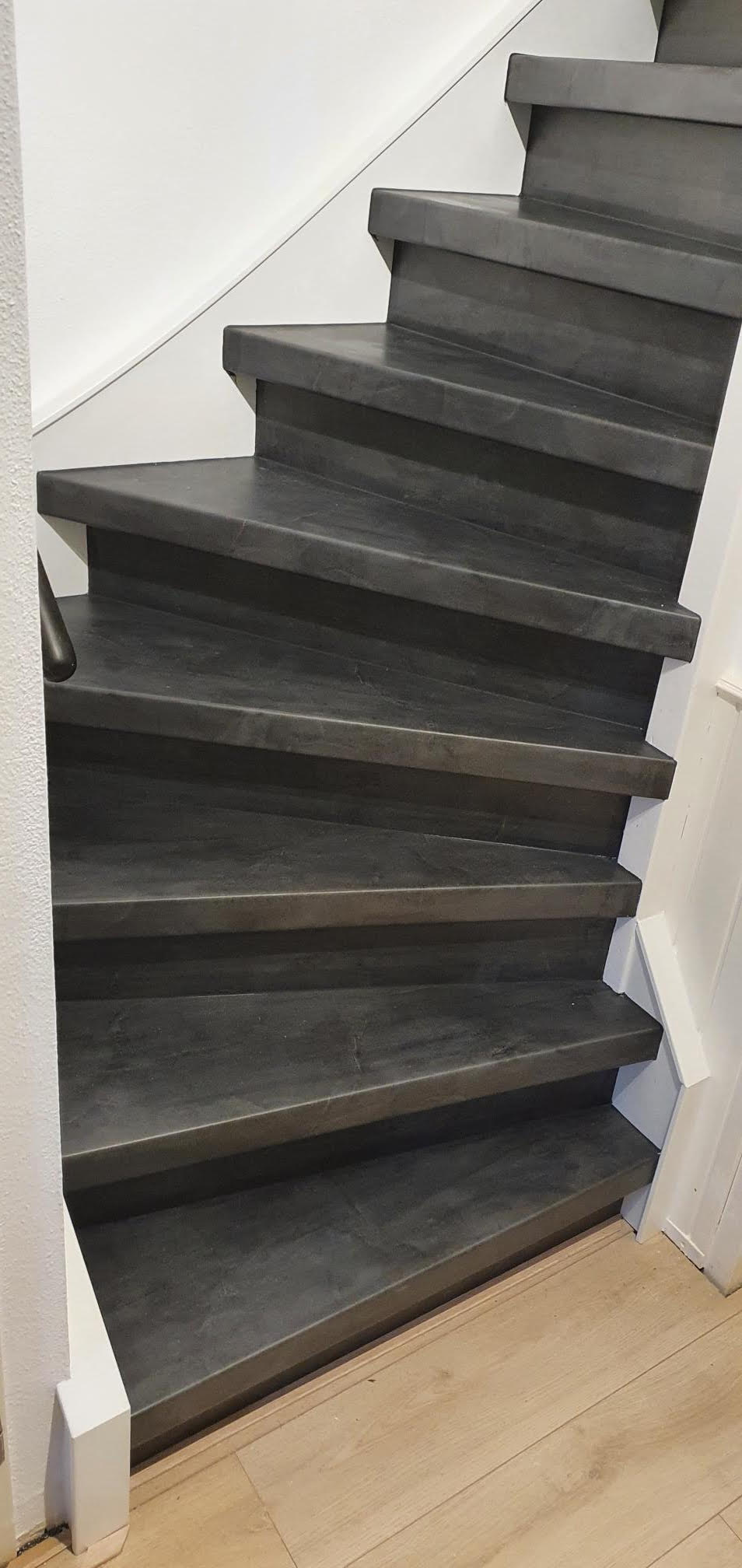 HPL overzettreden is een opbouw van watervast geperst hout en zijn voorzien van een van een toplaag in HPL [ High-Pressed Laminaat ] de topplaat is 0.6 mm dik en voorzien van een kras vaste anti slip laag de HPL overzettreden zijn 14 mm dik en de neus lat 20 mm, vaak is het nodig om hierbij de treden in te korten om mooi aan te sluiten aan de zijkanten van de trap.
